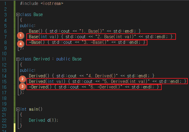 Derived(int val) : Base(val) { std::cout << "5. Derived(int val)" << std::endl; }