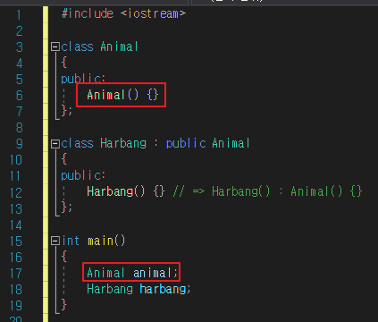 Harbang() {} // => Harbang() : Animal() {} // error 발생